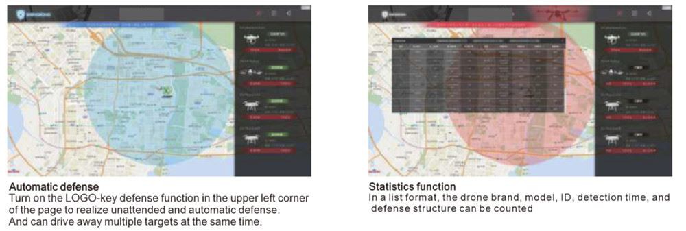 W przypadku włamujących się dronów możesz wybrać: Automatyczna ochrona z jednym -kluczem: po aktywacji funkcji ochrony systemu dron włamaniowy będzie automatycznie chroniony przez system bez personelu na służbie; Ręczna interwencja: Możesz ręcznie wybrać obronę dowolnego drona i sposób obrony czasu lub przerwać obronę, a także możesz wybrać lokalizację pilota.